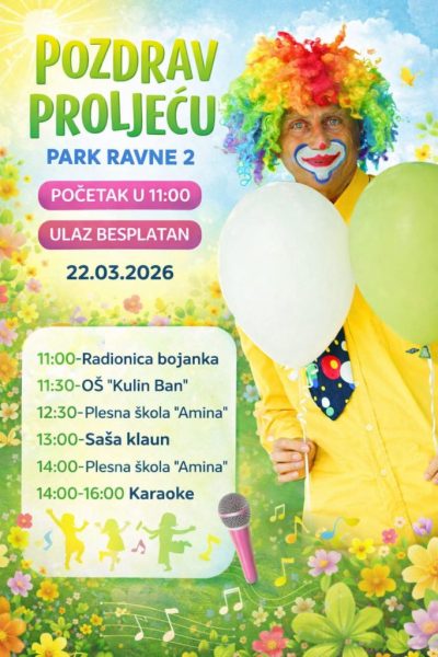 Događaj „Pozdrav proljeću“ u Parku Ravne 2 bit će prilika za zajedničko druženje djece, roditelja i posjetilaca u prirodnom ambijentu parka, uz program ispunjen smijehom, igrom, muzikom i kreativnim nastupima. Cilj ovog okupljanja je simbolično obilježiti dolazak proljeća i stvoriti prostor za radost, druženje i pozitivnu energiju.