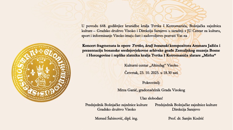 BZK GD Visoko i Direkcija Sarajevo u saradnji sa JU Centar za kulturu, sport i informisanje Visoko, organizuju koncert fragmenata iz opere “Tvrtko, kralj bosanski”, autora Ammara Jažića uz prezentaciju bosanske srednjovjekovne arhivske građe Zemaljskog muzeja BiH i replike zlatnika kralja Tvrtka I Kotromanića zlatare “Mirha”.